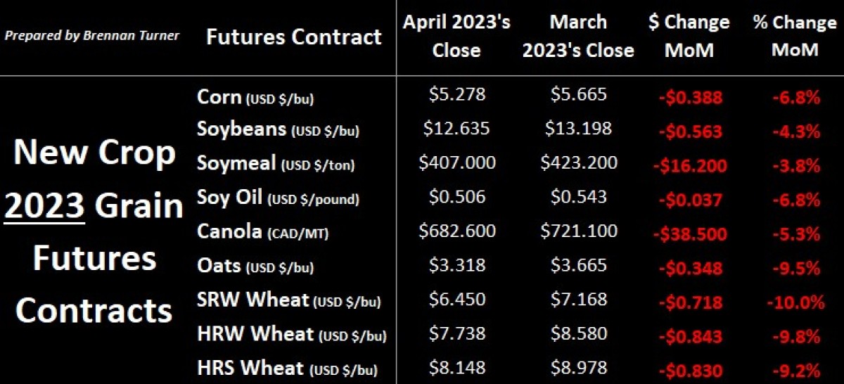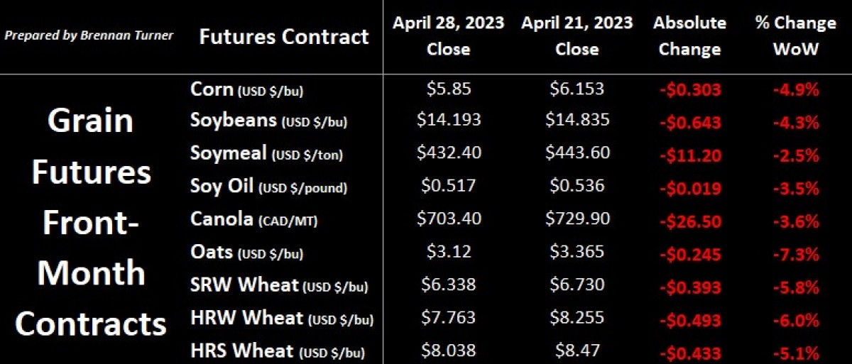 Grain markets pushed higher on Friday, but it wasn’t enough to reverse the previous four days of heavy fund selling and profit-taking to end the month of April. There’s optimism that Friday’s turnaround may signal bargain buying to start the month of May, with last week’s sell-off mirroring that of end the of February due to March contract’s option expiry. That said, as we flip the calendar into May, there’s seemingly less concern from managed money that the crop will get planted, despite the data telling us we’re already behind in spring wheat and winter wheat crop ratings remain at historic lows. Conversely, while the rain that fell last week in the U.S. Southern Plains isn’t drought-busting, it certainly helps the HRW winter wheat fields that are still hanging on. Adding to the bears’ momentum, using 4-month-old survey responses from a smaller-than-usual pool of farmers, Statistics Canada suggested Canadian wheat acres for 2023/24 will be 27M, an increase of 7% or 1.75M more acres than last year!
