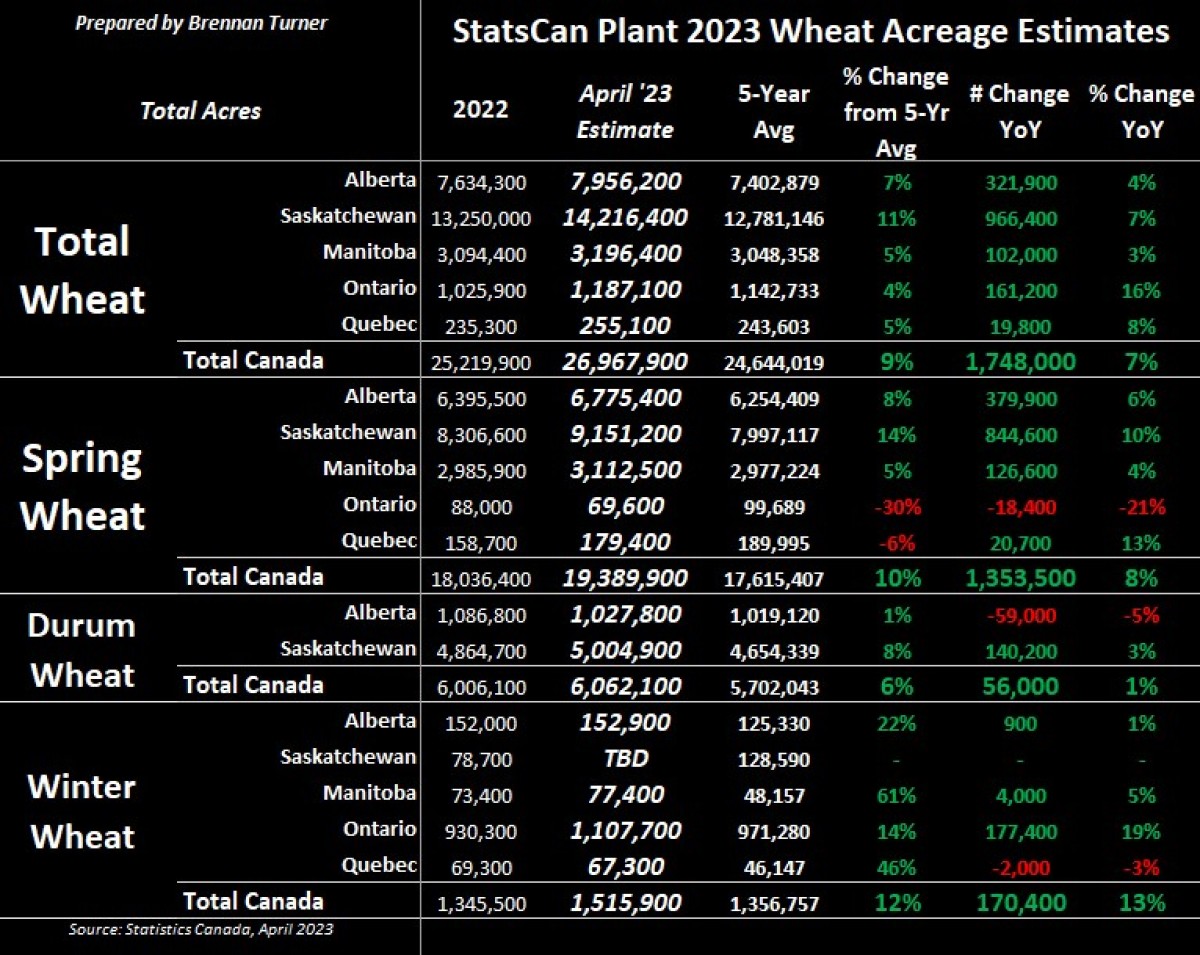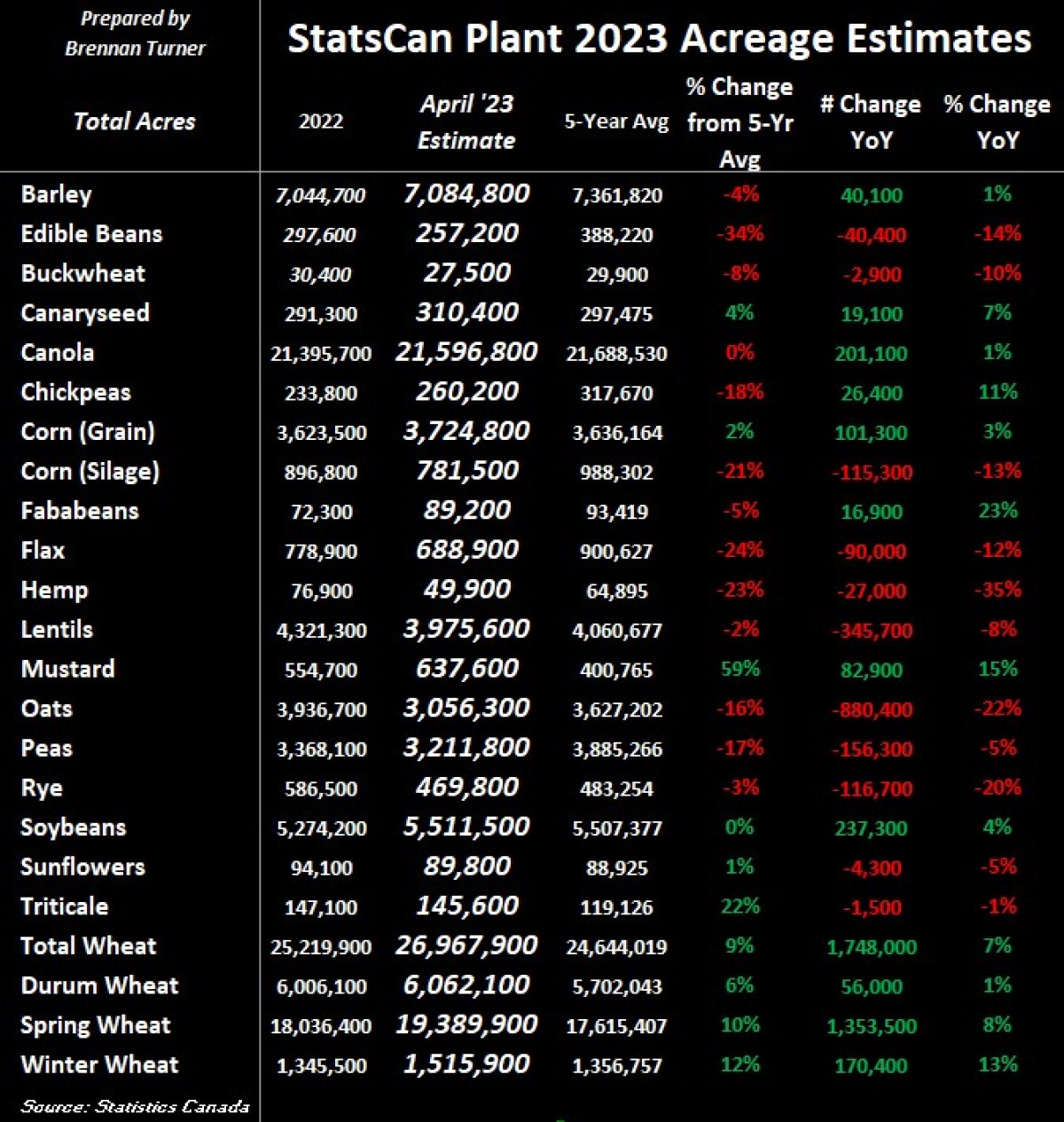 Personally, I believe that the barley, oats, and lentils numbers are too low, the spring wheat number is too high, but durum is probably about right. As I’ve suggested a few times in 2023, we tend to respond to high prices with higher acres, which pushes the price pendulum to swing another way. Nowhere is this more relevant than in Ontario, where winter wheat acres pushed back up over the 1M after last year’s dip, and in Saskatchewan, where spring wheat’s nearly 850,000 expansion is a 10% jump year-over-year. Assuming Mother Nature plays nice this growing season, I wouldn’t be surprised if Agriculture Canada raised its 2023/24 total wheat carryout up above 6 MMT in their late May supply and demand update.