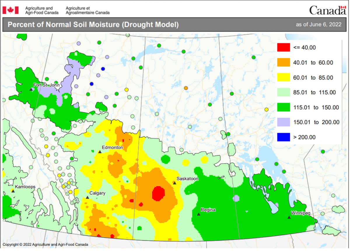 Back home in Canada, some very timely rains fell in the driest parts of the western half of the Canadian Prairies, but as the soil moisture map below from Agriculture Canada shows, the area still needs more (NOTE: this most current map from AAFC came before the rains fell this past week in Alberta and western Saskatchewan). It’s the opposite in the eastern Prairies as there’s a very healthy soil moisture profile and some warmer, sunny days are desired. According to last week’s Manitoba provincial government crop report, just 65% of acres have been seeded in the province (5-year average is 96%), and compared to this time in June, crop progress is about one month behind its normal stage! Therein, a tale is starting to emerge for the Canadian Prairies’ growing season of “Too Wet or Too Dry”.