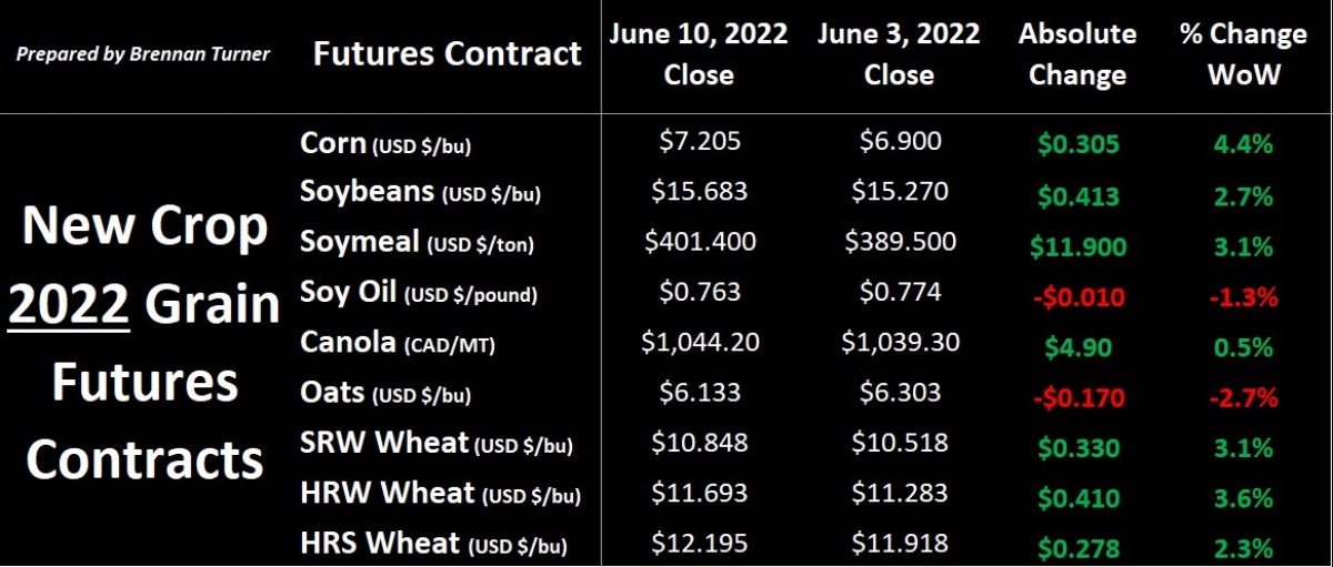 Grain markets neared the middle of June on a rebound, with all but soybean oil and oats finding a green finish after the previous week’s sell-off. The front-month soybean futures contract in Chicago closed at an all-time high because of ongoing supply concerns and strong U.S. export demand suggested by the USDA in their June WASDE report, released this past Friday. Corn was also supported by a similar supply concern + stronger demand dynamic, while wheat values remain volatile on just how much exportable supply will be available this year. Weighing on broader markets is decades-high inflation, which has certainly been a contributor as to why this is one of the most expensive crops that farmers have ever put in the ground.