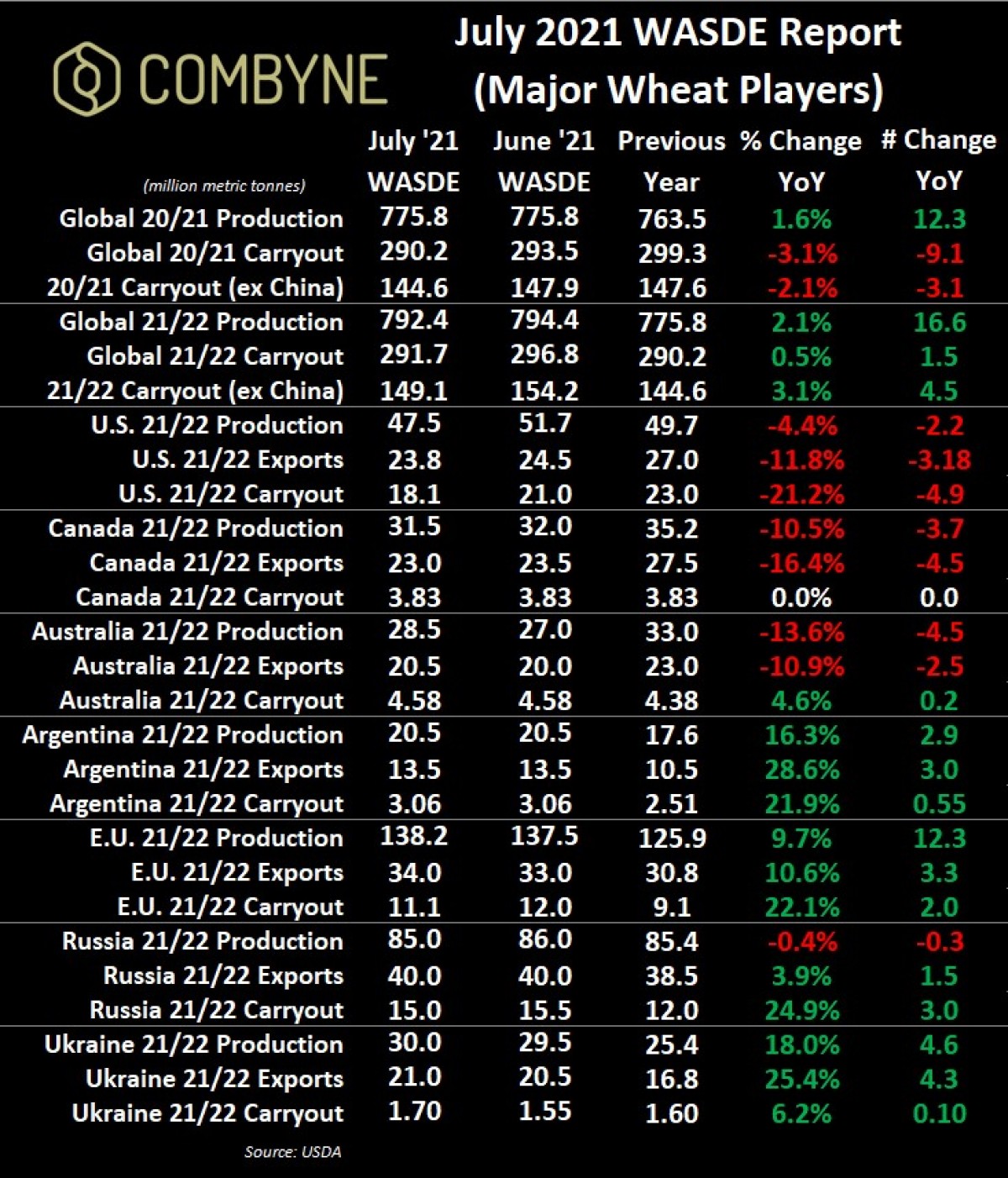 Looking abroad, Australia looks to be the winner of the North American drought as their 2020/21 record harvest of 33 MMT continues to be shipped out at a solid pace with old crop exports getting raised by another 1 MMT to now sit at 23 MMT. Further, thanks to good rains, Australia’s new crop, 2021/22 wheat harvest is now pegged by the USDA at 28.5 MMT, up 1.5 MM from the previous estimate. Similarly, the 2021/22 European harvest was improved by 700,000 MT, while exports were raised by 1 MMT; Ukrainian wheat production and exports were also both increased by 500,000 MT to 30 MMT and 21 MMT, respectively. On the flipside, Kazakhstan and Russian wheat harvests were each othered by 1 MMT, but their exports stayed the same.