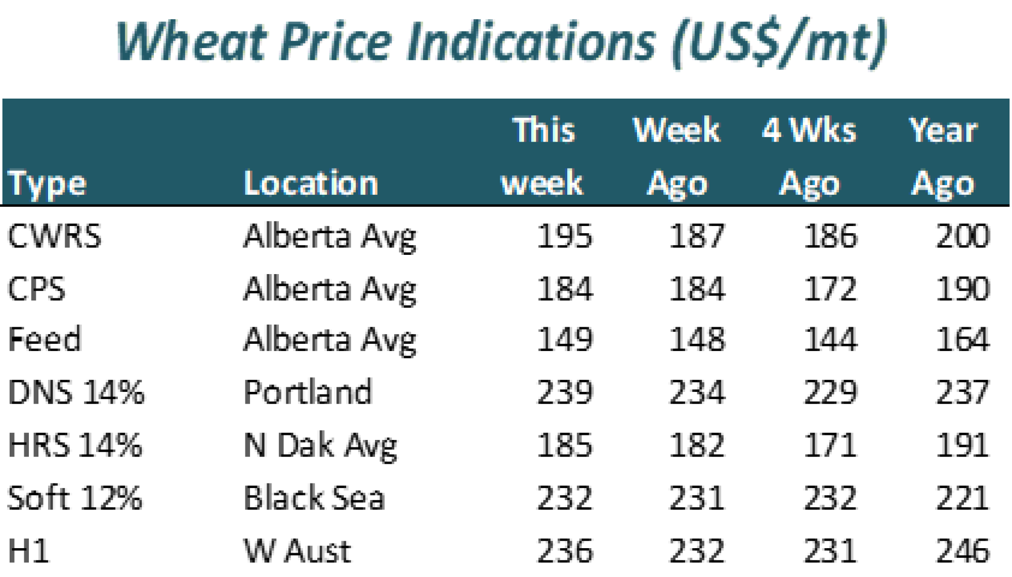 - Hard red spring prices continue to move higher in western Canada, North Dakota and the futures market, helped by strong early season exports. Global wheat supplies are too large to allow for significant upside, but the trend for hard red spring wheat remains steady-to-modestly firmer on the back of good demand.