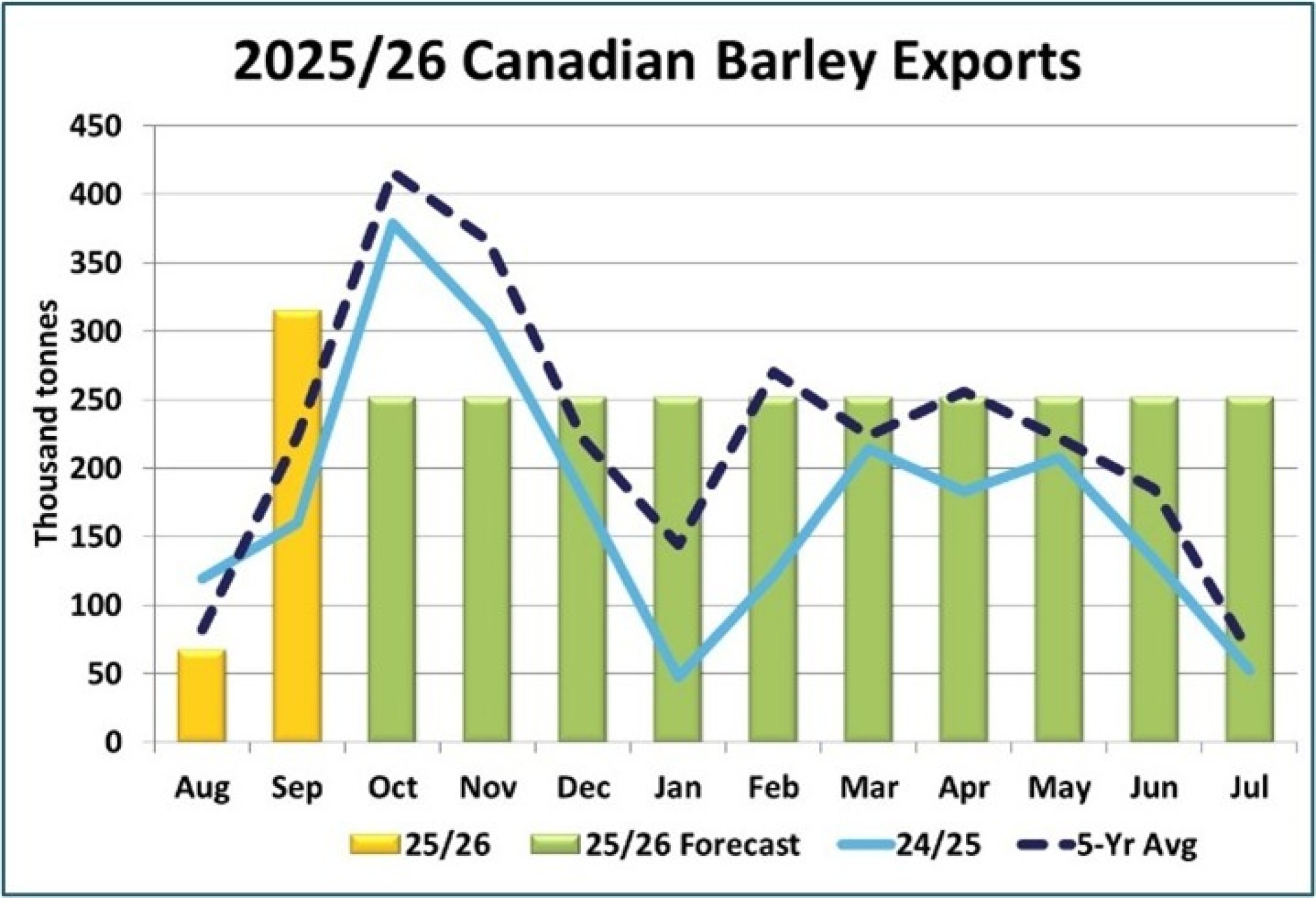 - September barley exports reported by the CGC were a solid 315,000 tonnes, including a vessel to Saudi Arabia.