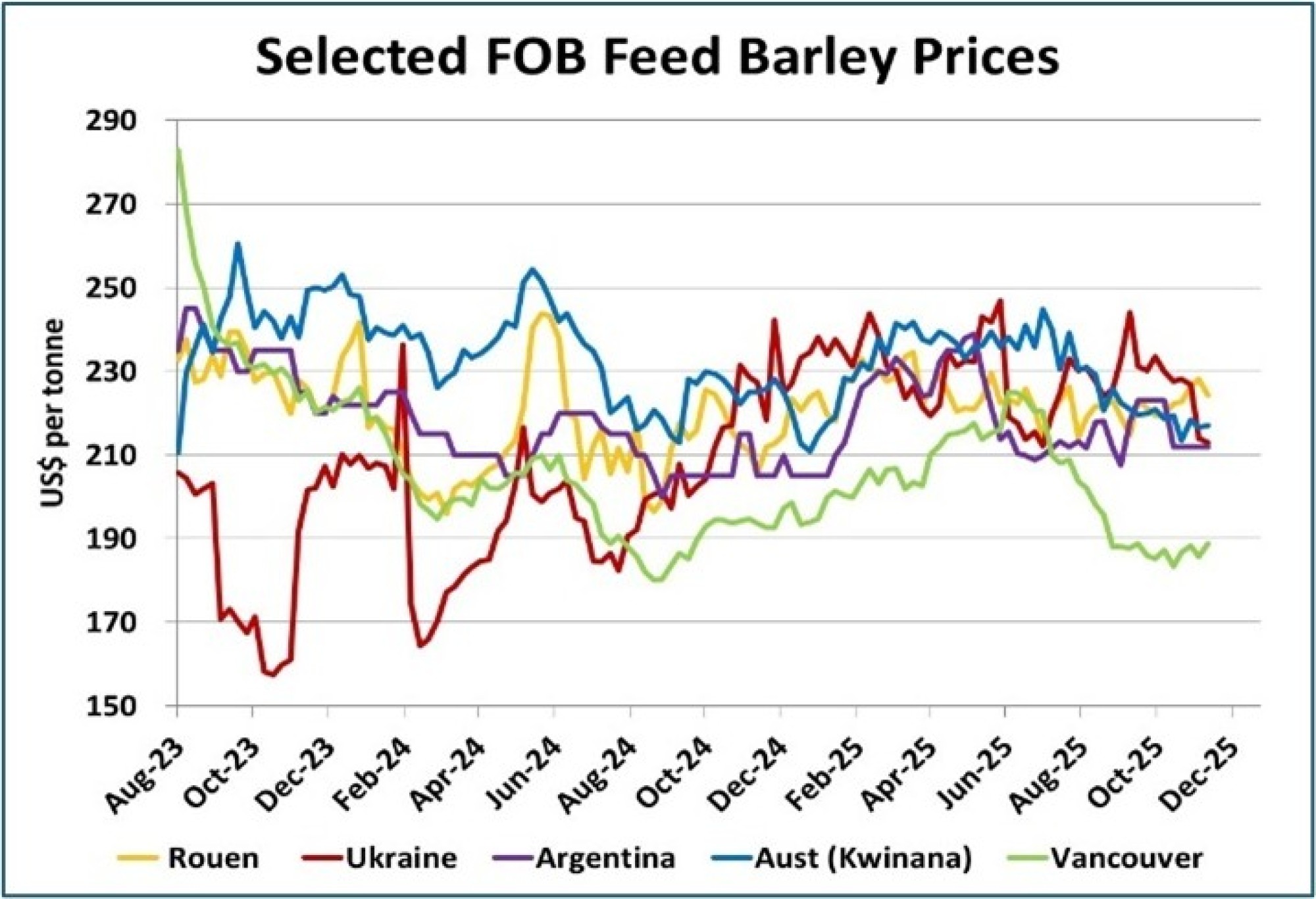 - Clearly, low barley prices in western Canada and at west coast terminals are doing their job of encouraging exports, with a record pace so far in 2025/26. One key question is whether Chinese buyers will shift to Australia once its 2025/26 harvest is available. Australian barley prices have been declining but remain at a sizable premium to Canada, which should still position Canadian barley favorably.