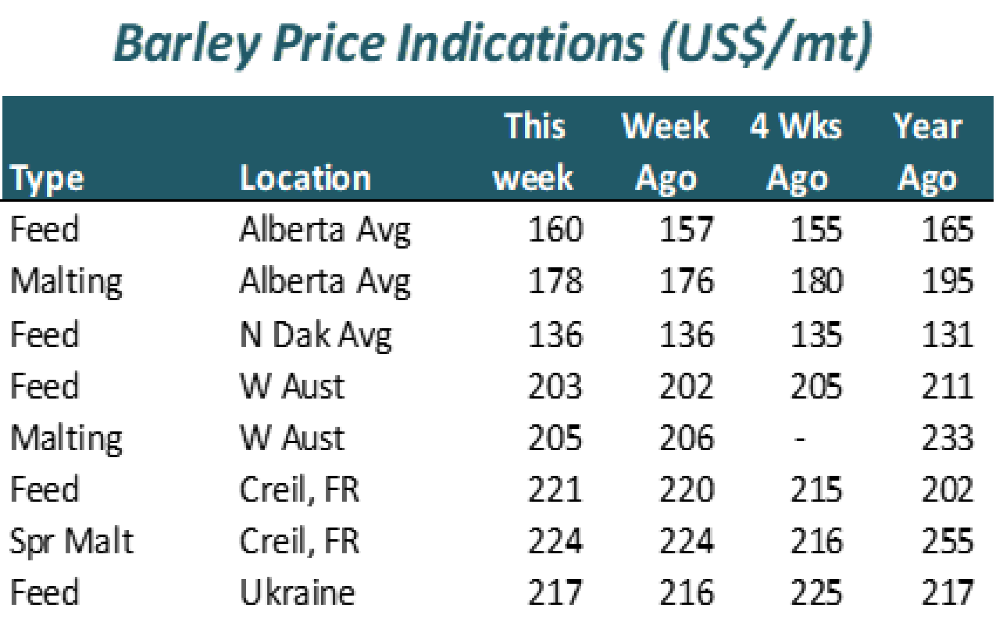 - Elevator bids for feed barley are showing modest gains, in line with the seasonal tendency.
