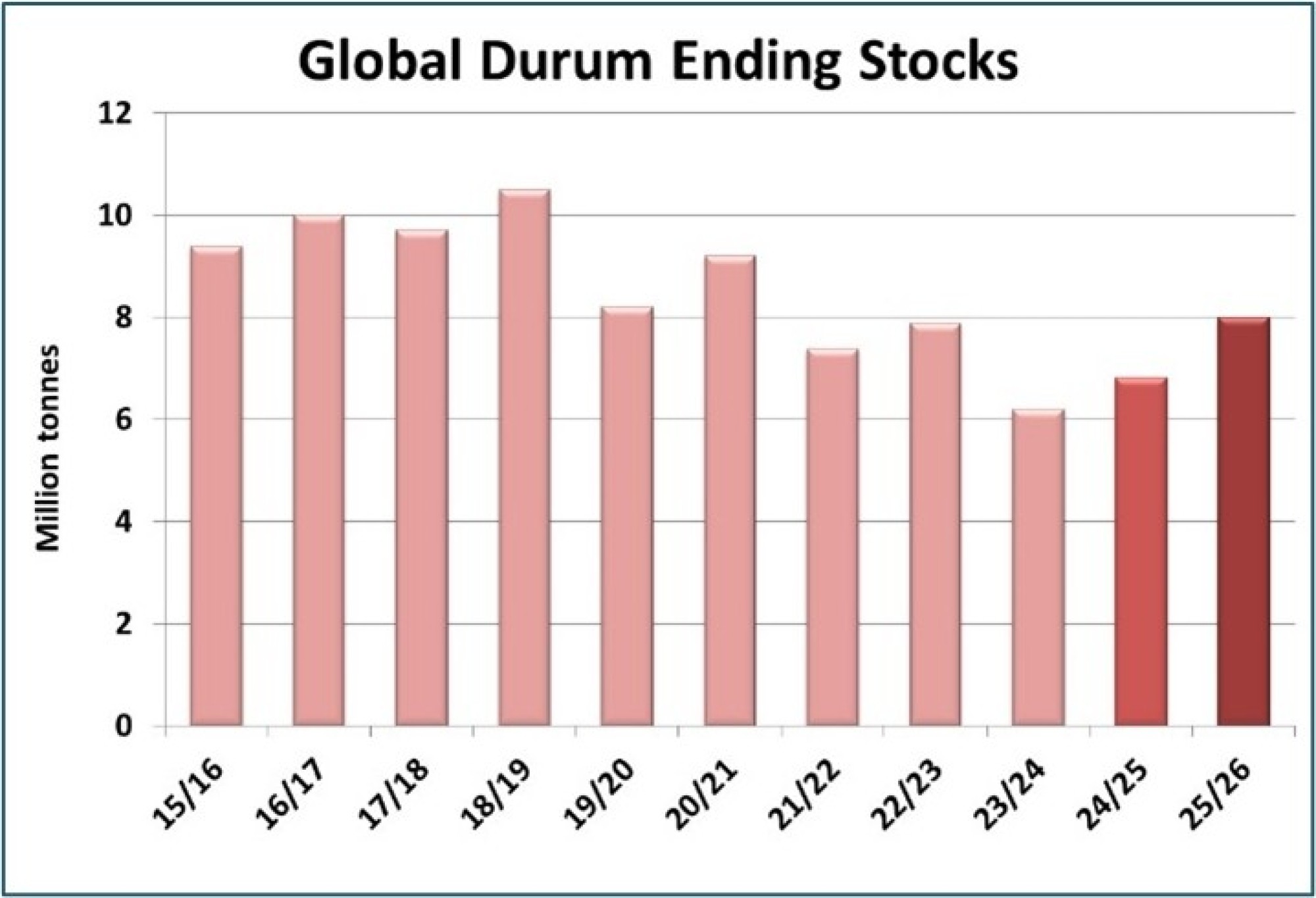 - The latest IGC report increased global durum ending stocks for 2025/26 to 8.0 mln tonnes. That’s up from its previous estimate of 7.50 mln and last year at 6.84 mln tonnes. The IGC is still using the Canadian production estimate from StatsCan at 6.54 mln tonnes, while the crop is likely over 7.0 mln tonnes, which would add even more to the stocks total. Even with its Canadian crop estimate, the IGC’s supply numbers mean the durum market will struggle to post meaningful gains this year.