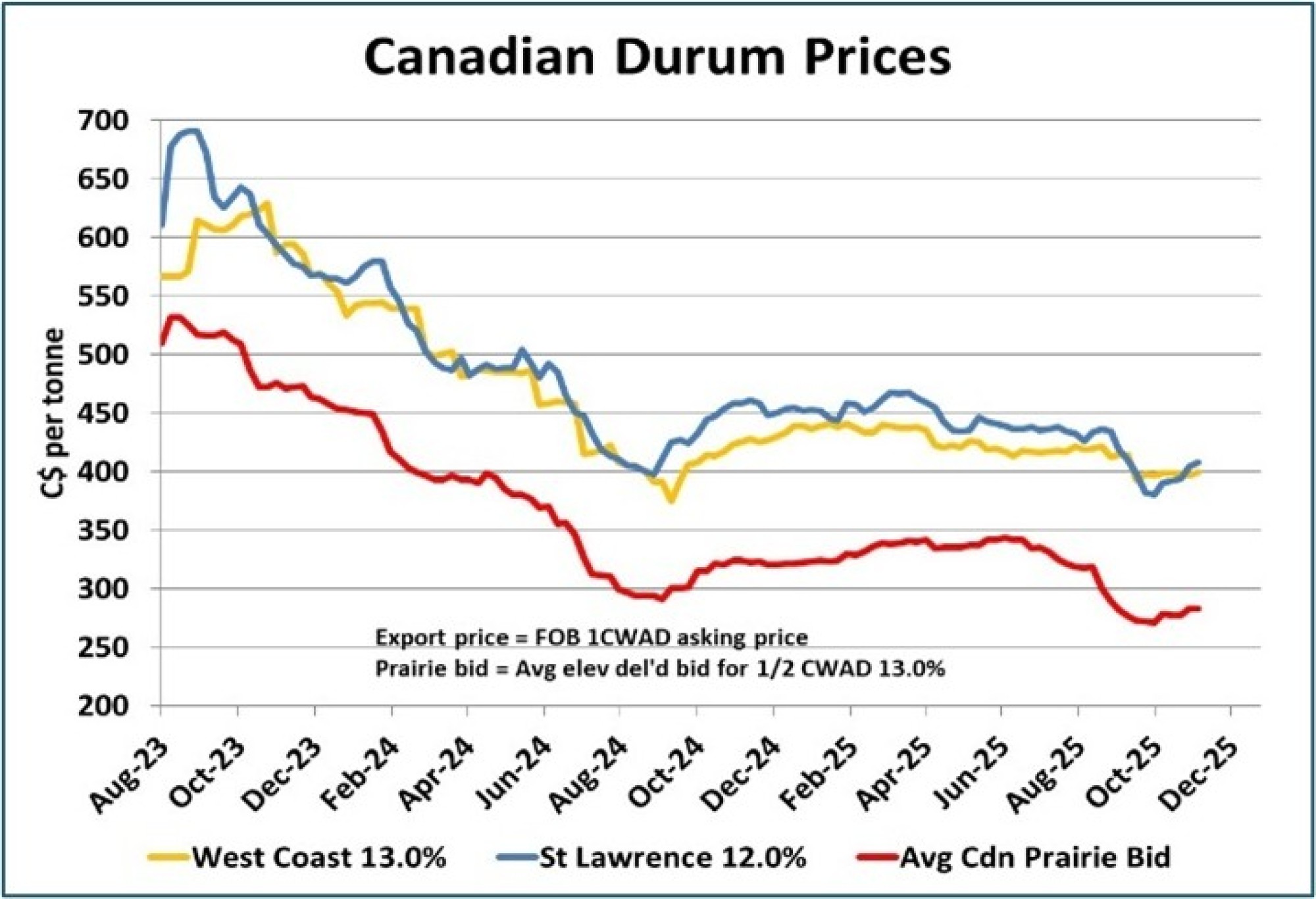 - The average durum bid in western Canada has edged slightly higher from the harvest lows. There seems to have been a stronger recovery in St. Lawrence offer prices while west coast offers are essentially flat. In all locations, durum prices are still at the bottom end of the range from most of 2024/25. Seasonal highs for durum bids tend to show up in mid-November with spring rallies quite infrequent.