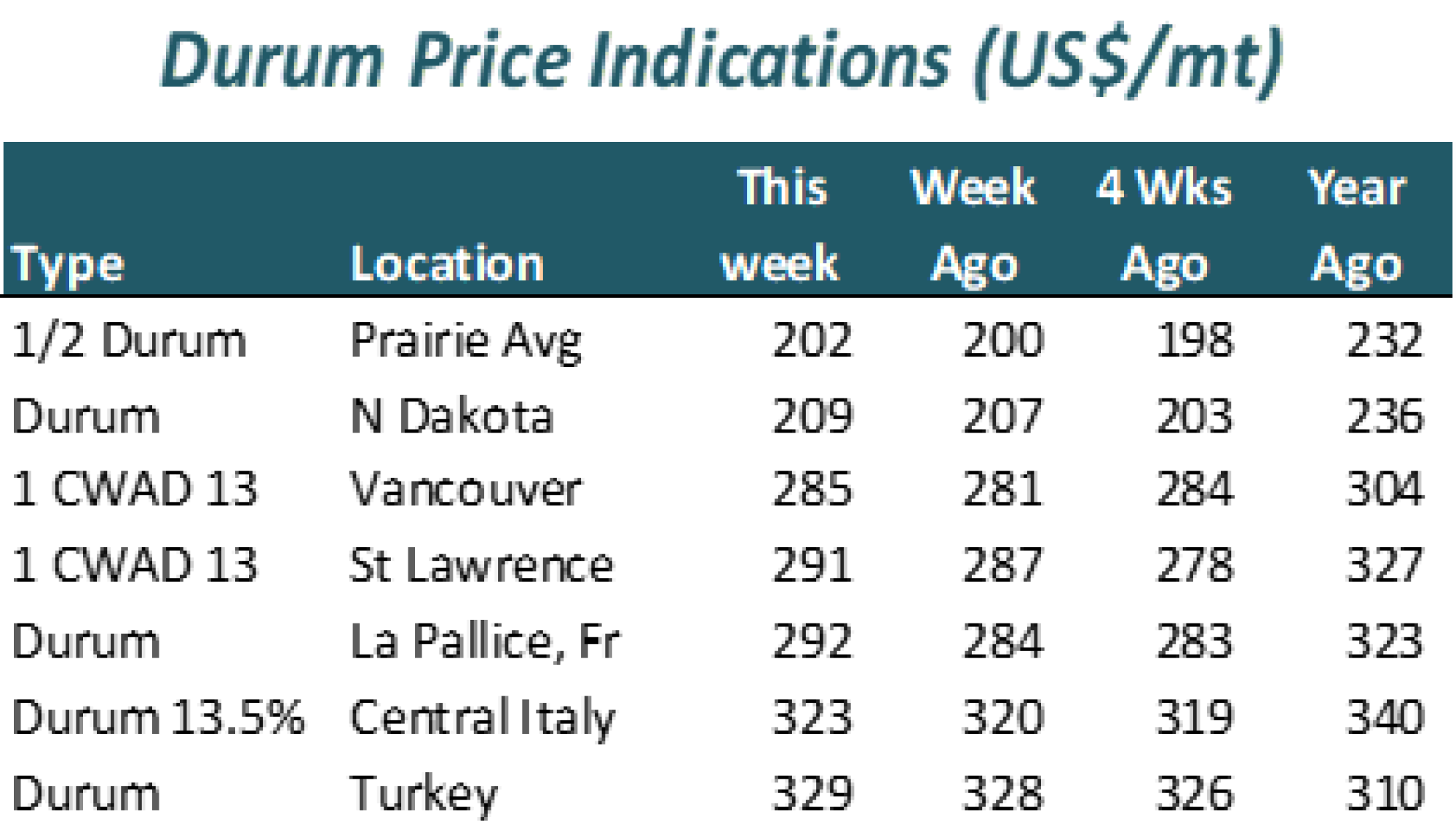 - Country durum bids are edging higher while the east coast is firmer and Vancouver is flat.