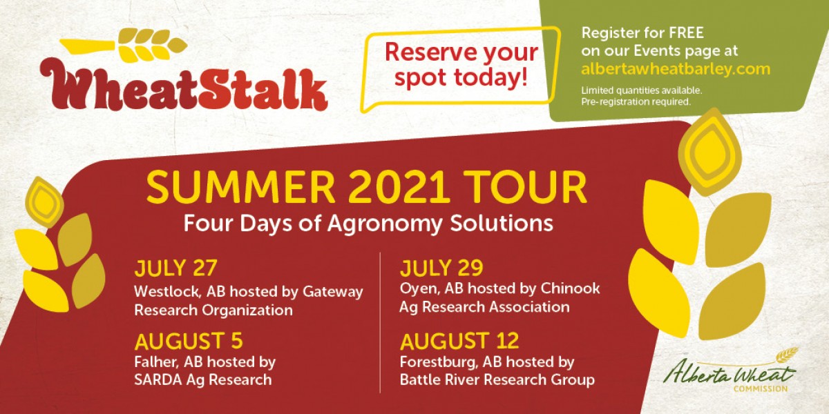 This year our plan for the Alberta Wheat Commission’s (AWC) summer extension extravaganza, WheatStalk, includes a new and exciting change from previous years. Rather than a single event, WheatStalk 2021 will be hitting the road to bring agronomic solutions to farmers across Alberta’s various regions through a multi-stop event tour. AWC has partnered with Gateway Research Organization (GRO), Chinook Applied Research Association (CARA), SARDA Ag Research, and Battle River Research Group (BBRG) for four separate, wheat centric, days of learning. Together, AWC and each of the four co-hosts will provide valuable agronomic information that is relevant to your region.