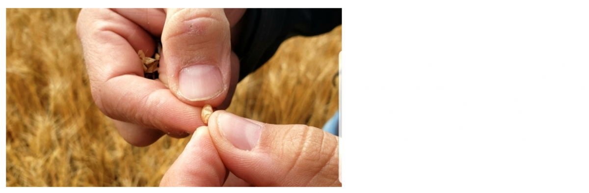 The label recommendation for pre-harvest glyphosate on wheat and feed barley is less than 30% moisture. At 30% moisture, the kernels are 30% water, by weight. If you weighed that kernel and then put it in an oven at 100°C until it stopped losing weight, it will retain 70% of its original mass due to a loss of moisture within the kernel.
