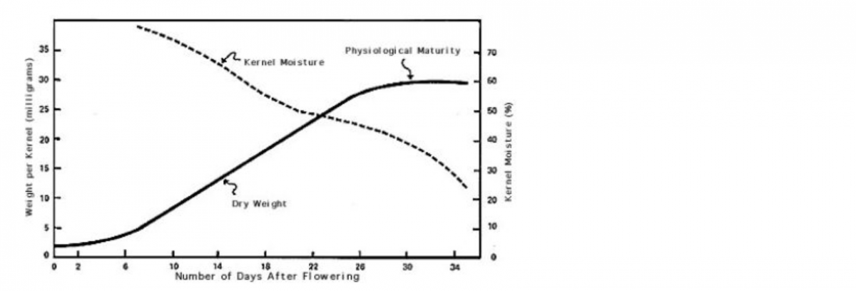Sourced from Minnesota State University Extension, Figure 1 demonstrates the typical medium maturity spring wheat variety kernel maturity process. You will notice that as the wheat reaches physiological maturity, the point at which dry weight increase slows and stops, the kernel moisture is still at or above 40%.