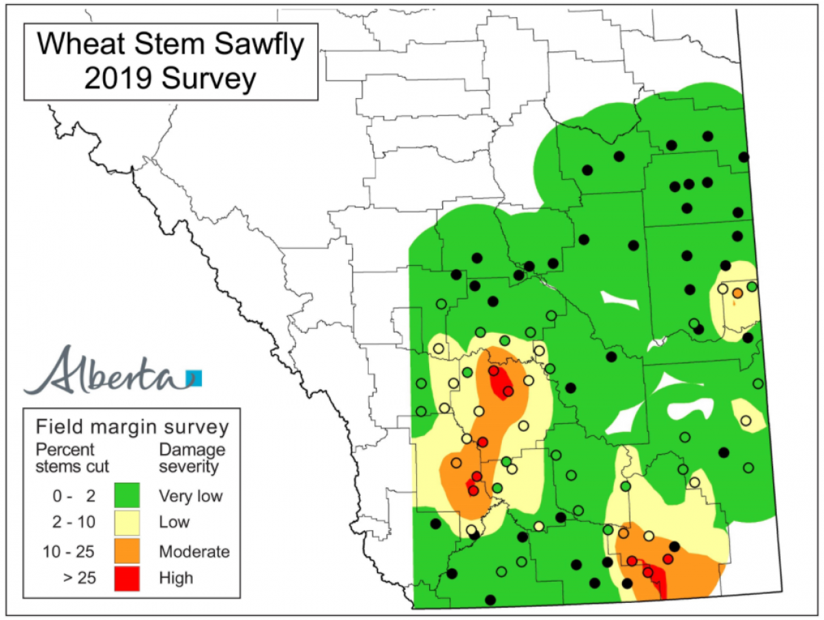 The Wheat Stem Sawfly Map is based on cut stem counts conducted in the fall of 2019 and the damage ratings are based on 90 fields in 21 municipalities. In each field the number of wheat stem sawfly cut and the number of uncut stems are determined in a one meter of stubble in 4 locations. Overall the sawfly risk remains lower than the outbreak levels of the early 2000’s but the increase sawfly damage in many spots of southern Alberta signals a resurgence due to the dryer conditions over the past few years. The random nature of the survey means that individual fields may still have higher wheat stem sawfly populations than are indicated in the survey map. Field locations denoted by a black dot had zero sawfly found in the survey.